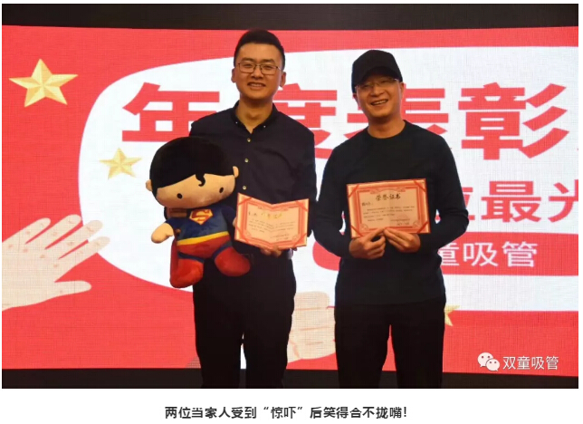 在“雙童”年會現(xiàn)場,吸管妞給“雙童”當(dāng)家人樓仲平和二當(dāng)家李二橋頒發(fā)了史上最大膽的獎項?。ㄊ孪葲]有透露哦)