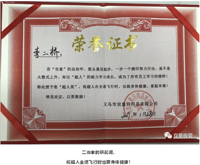 榮譽證書:李二橋,在“雙童”的這些年,您從基層起步,一步一個腳印努力付出,雖不是火箭式上升,卻以“超人”的耐力學(xué)習(xí)成長,成為了所有員工學(xué)習(xí)的榜樣!特此授予您“超人獎”,祝超人在全速飛行時,也能身體健康,家庭幸福!