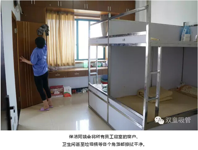 “雙童”員工集體寢室的不銹鋼床架可是參觀團(tuán)隊(duì)最津津樂道的話題之一!這些床架都是由“雙童”樓仲平自行設(shè)計(jì),在建造之初就把床架焊在地上。這樣一來,即避免產(chǎn)生垃圾死角,床下又多了一個(gè)封閉的儲(chǔ)物空間,確保員工在生活方面的便利舒適!