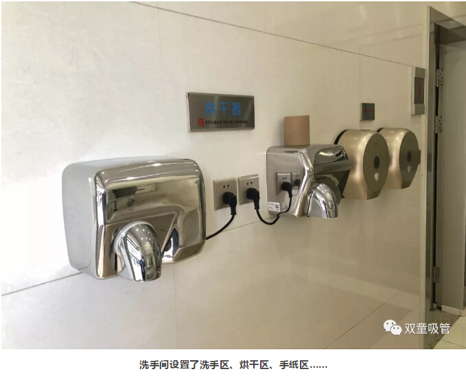 “雙童”每個洗手間的格局分明,除了男女衛(wèi)生間外,還設置了殘疾人洗手間。洗手區(qū)、烘干區(qū)、手紙區(qū),各個區(qū)域的配置十分齊全。進入衛(wèi)生間前,員工可以在手紙區(qū)取紙巾。洗手后,還可以用烘干機把手烘干。