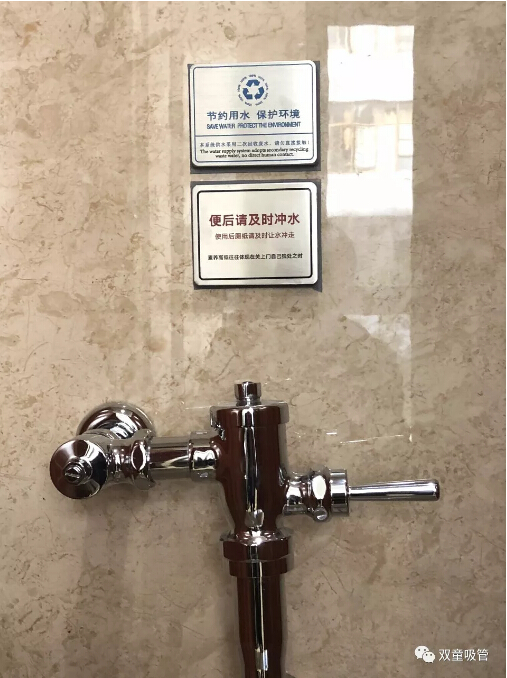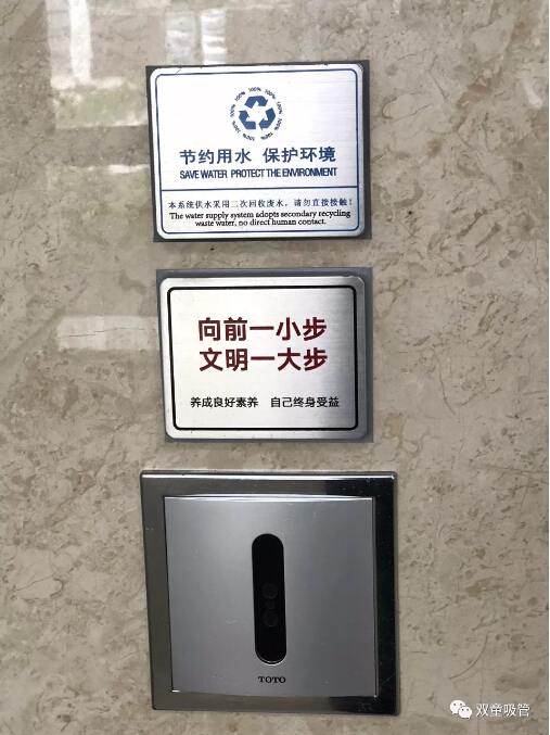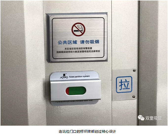 除此之外,“雙童”衛(wèi)生間還有許多文化引導的標示牌。如:每扇門上都會有“公共區(qū)域,嚴禁吸煙”的標識,每個蹲位后面都有“便后請沖水、素養(yǎng)高低往往體現(xiàn)在關上門自己獨處之時”等溫馨提示,從而引導員工提高自身素質,形成文化宣導氛圍!