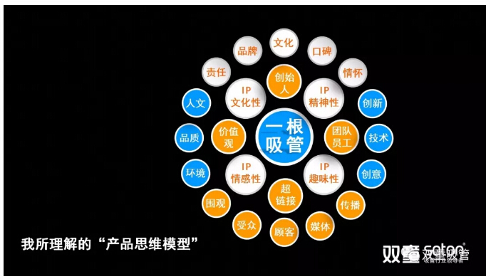 在這個(gè)模型中,吸管本身是一個(gè)產(chǎn)品,在產(chǎn)品本身內(nèi)核不發(fā)生改變的情況下,產(chǎn)品之外的“品質(zhì)”、“信譽(yù)”、“品牌”、“文化”等屬性不斷地外延,并通過(guò)“創(chuàng)始人”、“團(tuán)隊(duì)員工”、“價(jià)值觀”等又形成了產(chǎn)品的種種不同屬性。