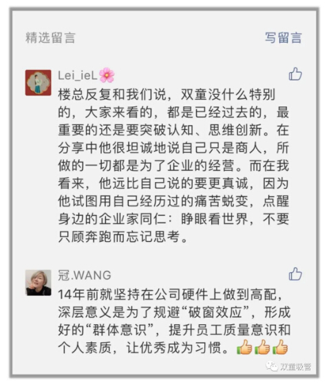 我和樓總其實(shí)之前就認(rèn)識(shí),2017年我?guī)е懈邔觼?lái)過(guò),但是今天來(lái),感覺(jué)變化很大、企業(yè)文化建設(shè)很完善。您剛才提到2016、2017年企業(yè)的陣痛我之前沒(méi)想到,我們公司也是近兩年進(jìn)入快速發(fā)展期,人才跟不上。原來(lái)想踩剎車、慢一點(diǎn),現(xiàn)在我更堅(jiān)定要跑快一點(diǎn)。今年,我決定我們整個(gè)公司就定下來(lái)要學(xué)習(xí)“雙童”。