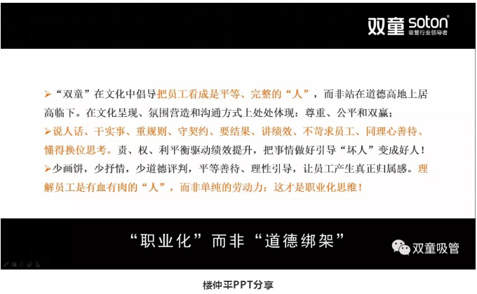 在看完樓仲平的視頻之后,可能很多人會心存疑慮:“雙童”明明是倡導(dǎo)"家文化"的企業(yè),竭盡所能對員工好,為什么不能讓員工在企業(yè)里談人情、感恩和奉獻(xiàn)呢,這難道不矛盾嗎?