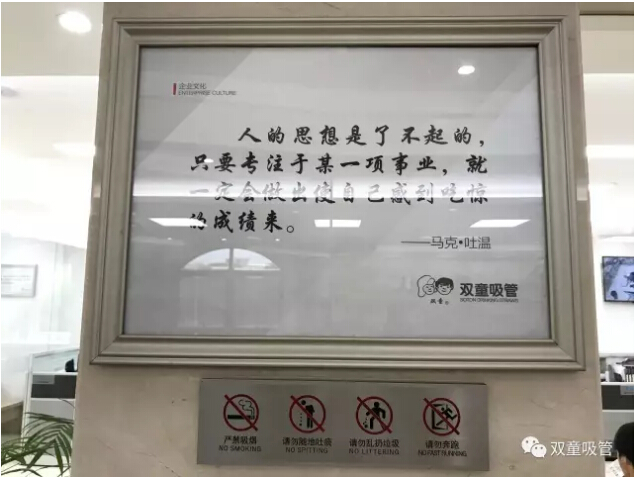 原來(lái),在“雙童”行政樓的墻上,到處都掛著一幅幅精致的鏡框,而鏡框里的內(nèi)容,就是能夠體現(xiàn)“雙童”核心文化價(jià)值觀的文化標(biāo)語(yǔ)!