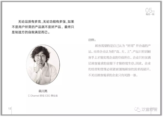 無(wú)論品質(zhì)有多高,無(wú)論功能有多強(qiáng),如果不是用戶(hù)所需的產(chǎn)品就不是好產(chǎn)品,最終只是制造方的自我滿(mǎn)足而已。——森川亮