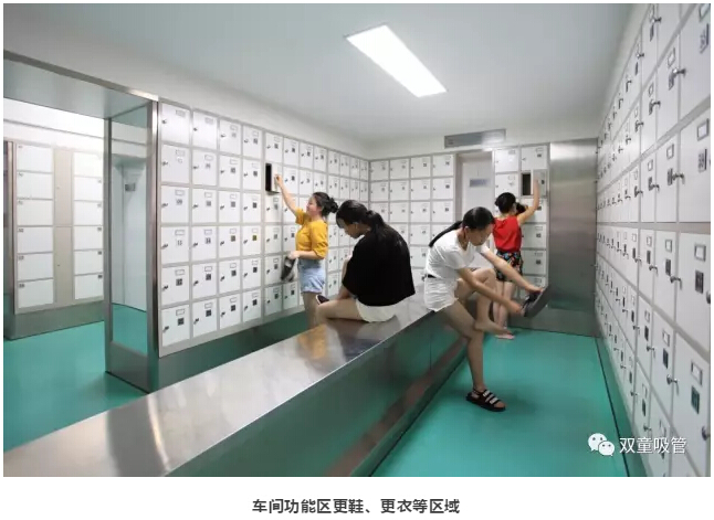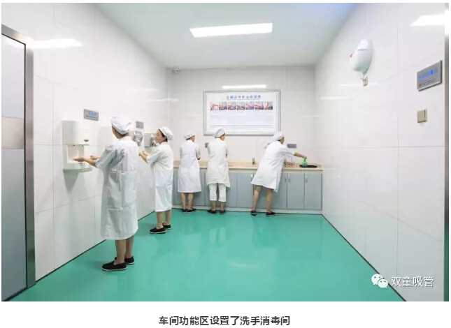 在生產(chǎn)車間入口,“雙童”設(shè)置了車間功能區(qū),內(nèi)有更鞋區(qū)、更衣區(qū)、洗手消毒區(qū),風(fēng)淋室等區(qū)域,配置了高端的烘干器、消毒器、感應(yīng)水龍頭以及酒精消毒器等硬件。員工們在車間功能區(qū)進(jìn)行工作服更換、洗手消毒、風(fēng)淋等一系列操作后,才可進(jìn)入生產(chǎn)車間。