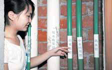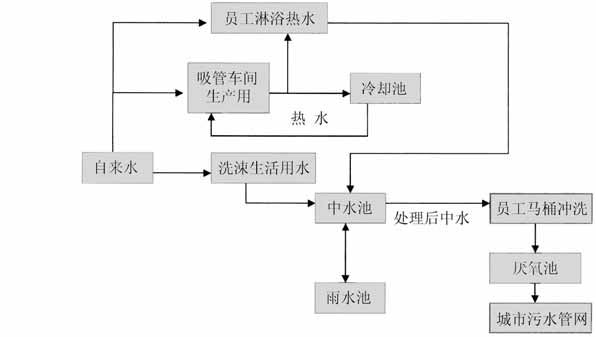 從上圖中可以了解到,雙童公司對水的利用可謂是費盡心機,每個衛(wèi)生間由6 路水管組成,第一路水管通的是自來水,用于員工洗臉、洗澡、洗衣服之用;第二路水管通的是純凈水,用于員工喝水;第三路水管通的是吸管車間冷卻水,自來水冷卻吸管后保持50 度左右的溫度,用于員工熱水洗澡、洗臉;第四路水管通的是員工洗臉、洗澡、洗衣服用完之后的水,這個水先經過過濾、凈化后到中水池中;第五路水管通的是中水池的水,用于員工馬桶沖洗;第六路水管通的是沖洗馬桶后的水,直接排到厭氧池中。