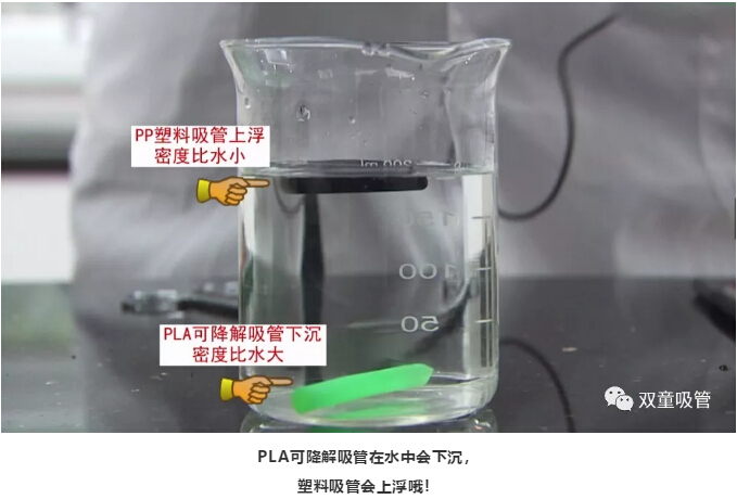 可降解吸管的密度是1.25g/cm3,塑料吸管的密度0.913g/cm3。將兩根吸管分別放入水中,由于密度不同,塑料吸管會浮起來,可降解吸管會沉下去,以此來區(qū)別兩種吸管。