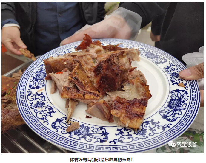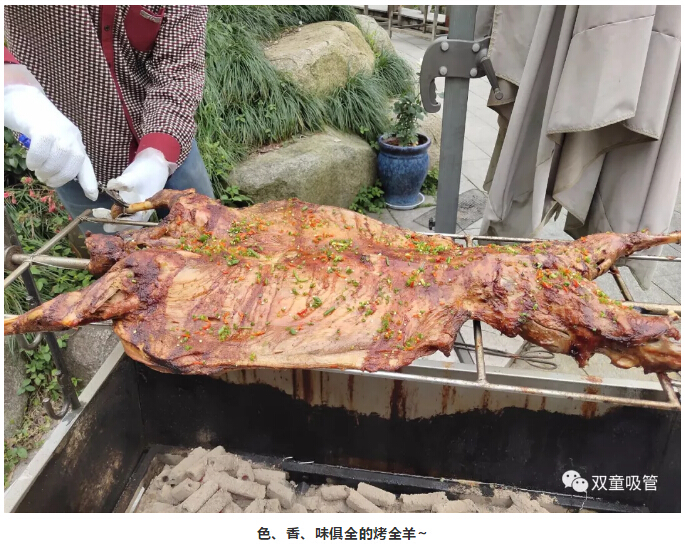 一到我們的目的地,就被眼前的這一幕吸引了,等待著我們的,竟然是一只香噴噴的烤全羊!吸管妞看得口水都要流出來啦!
