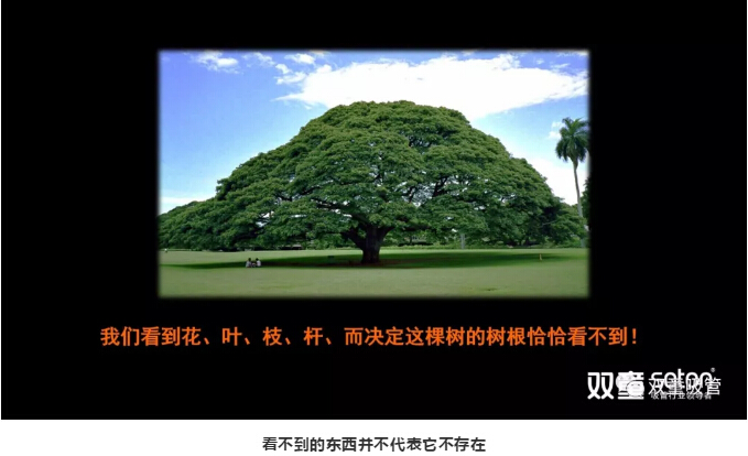 樓仲平通過“雙童”的圖集案例,引導(dǎo)大家認(rèn)知到,原來平常司空見慣的思維認(rèn)知并不一定是正確的。隨后,樓仲平通過一棵樹的圖片,再次引導(dǎo)大家思考:我們通過圖片能看到樹的樹干、樹枝、樹葉等等,但是真正決定這棵樹的樹根,卻并不能直接看到。