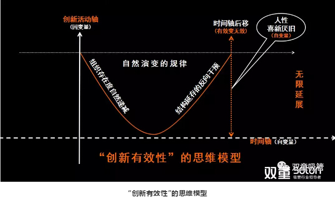 再通過進一步的推導,可以得出一個創(chuàng)新思維模型:組織作為萬物當中的組成部分,在自然演變的過程當中組織存在“自然遞減”。為了保證組織持續(xù)存在,就需要不斷地調(diào)整和干預,從而延緩組織存在度發(fā)生“自然遞減”的墮變現(xiàn)象,保持組織活力!