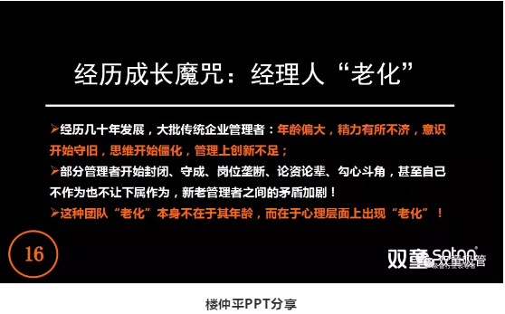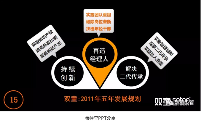 對于傳承問題,在2011年,“雙童”明確了子女不走接班權(quán),而是要讓核心員工持股,將所有權(quán)和經(jīng)營權(quán)分離。而在2018年的12月19日,在“雙童”第一期股權(quán)激勵啟動大會上,“雙童”首批12位核心員工正式簽約成為“雙童”的經(jīng)營伙伴,我們以股份合伙、業(yè)務(wù)合伙等“合伙激勵”的 方式讓優(yōu)秀人才變?yōu)楹匣锶耍寙T工和組織的目標長遠契合、共同生長、共享價值創(chuàng)造的有效延伸!