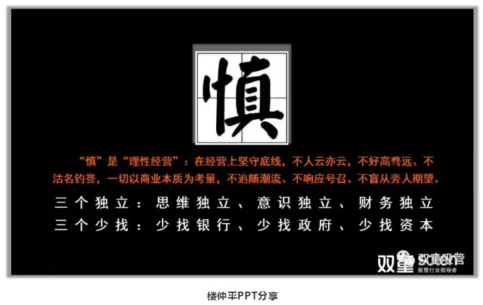 答:在流變時代下,企業(yè)要很好的“活著”,要有品質(zhì)、有尊嚴、有溫情、有責任、可持續(xù)發(fā)展,首先要具備的就是“慎”。在經(jīng)營上要有自己的獨立判斷,堅守底線,不人云亦云,一切以商業(yè)本質(zhì)為考量,不追隨潮流、不響應號召、不盲從旁人期望。基于以上,樓仲平也總結(jié)出“三個獨立”和“三個少找”: