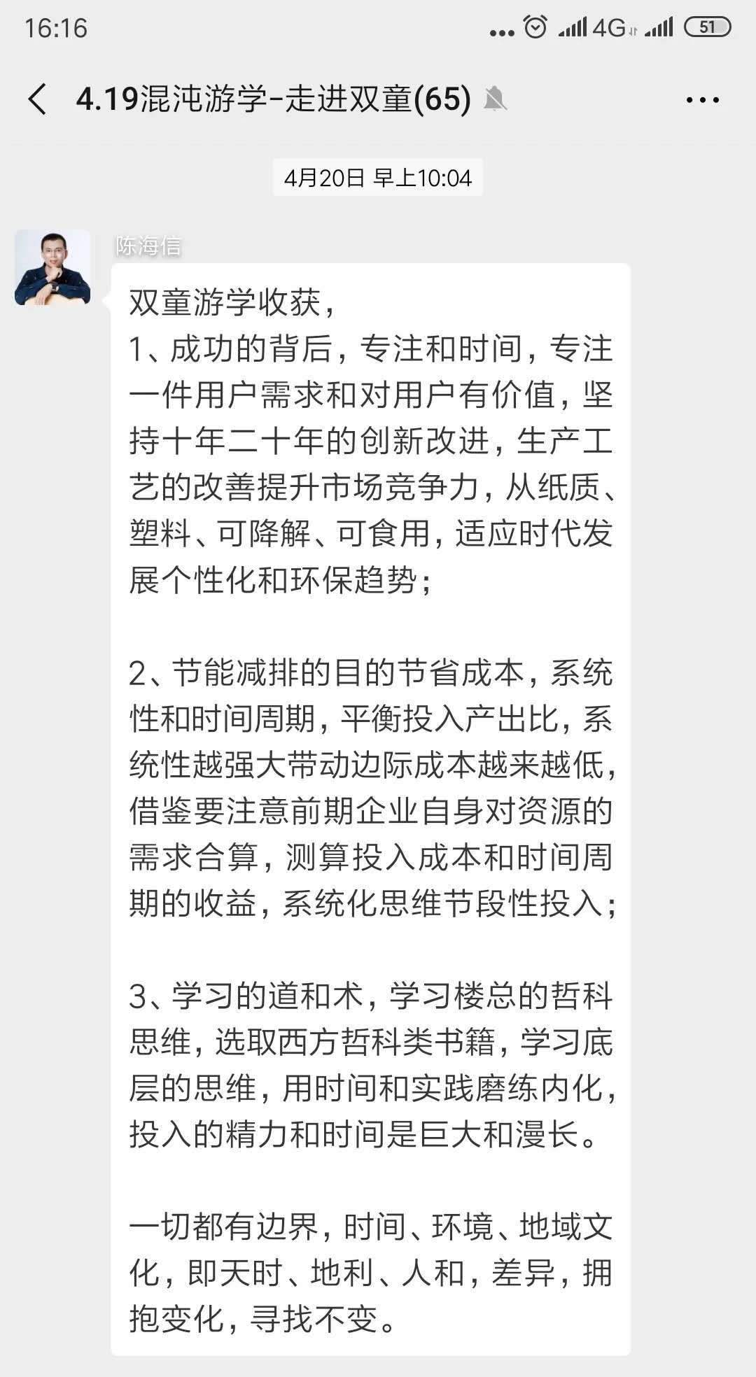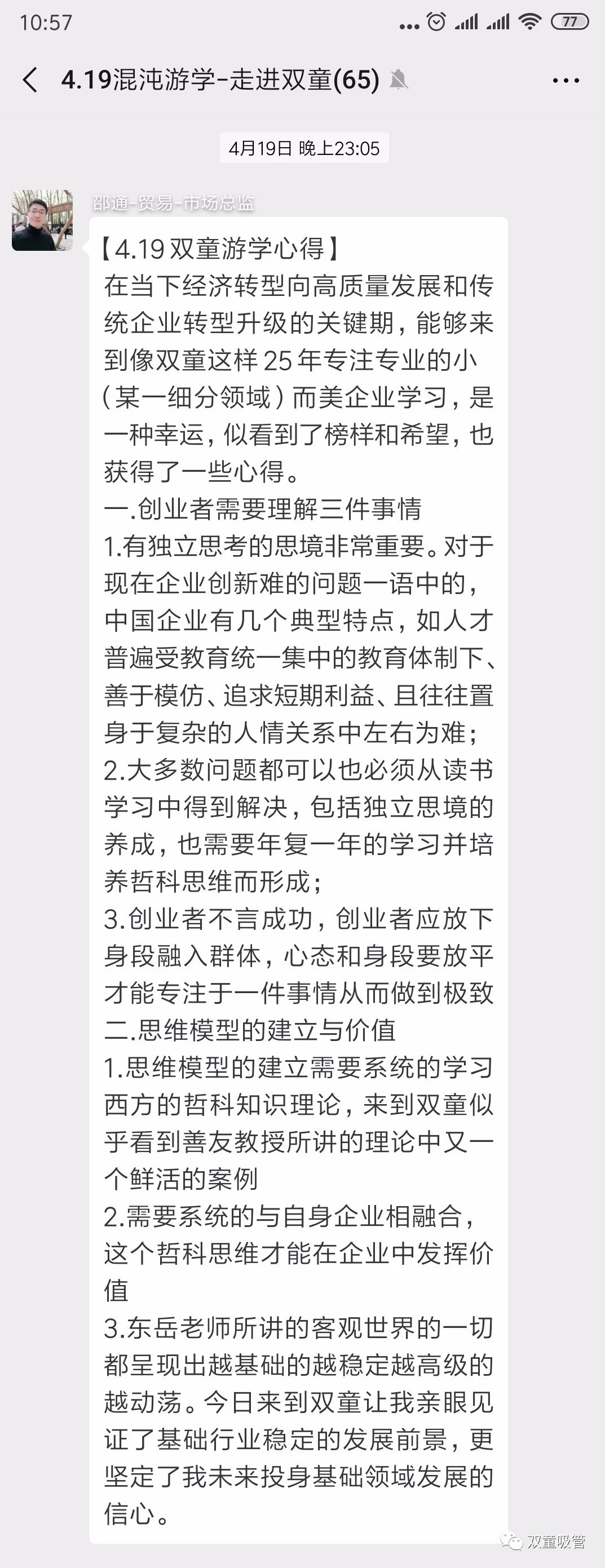 “這是一次刷新認知的游學,讓我對傳統(tǒng)行業(yè)有了極大的改觀”。這是上周五下午,混沌大學杭州分社的同學們在“雙童”游學后發(fā)出的最深刻的反饋。