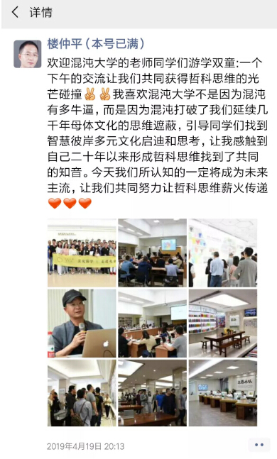 樓仲平也在朋友圈里分享了當天的感想,希望能和混沌大學的同學們共同努力,讓哲科思維薪火傳遞!