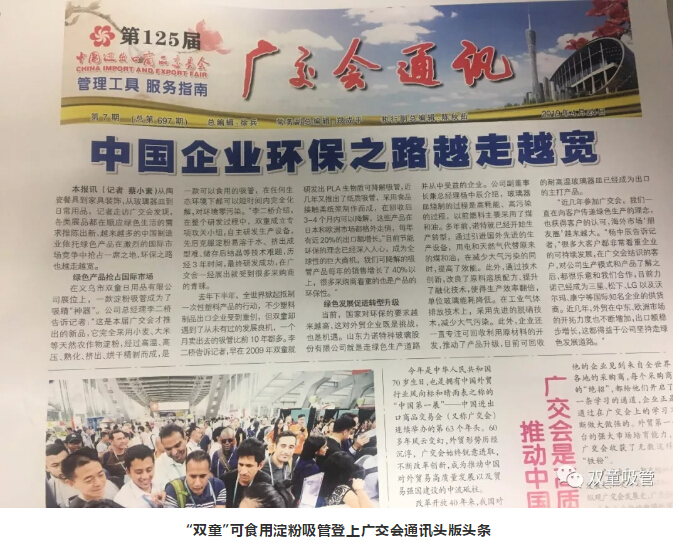 “雙童”可食用淀粉吸管除了吸引了大批客商之外,也引起了媒體朋友們的關(guān)注。“雙童”可食用淀粉吸管作為中國企業(yè)環(huán)保案例登上了廣交會(huì)通訊報(bào)的頭版頭條,在廣交會(huì)上一炮打響!