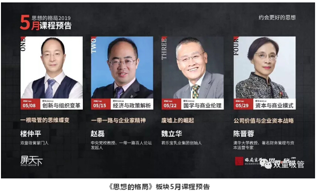 如果你沒有聽夠我和我父親的故事,請(qǐng)于5月8日來格局商學(xué),這是一家覆蓋全球50000位企業(yè)主的管理教育平臺(tái),我父親將在格局商學(xué)最核心的板塊《思想的格局2019》分享《一根吸管的思維蝶變》課程,引導(dǎo)大家突破表象認(rèn)知,理解底層邏輯,用互聯(lián)網(wǎng)的思維去理解產(chǎn)品!