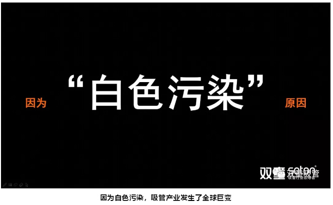 首先,樓仲平用一組精美的產(chǎn)品圖片向大家展示了“雙童”各式各樣的創(chuàng)新吸管,打破了大家認為吸管是“低、小、散、弱”小商品的傳統(tǒng)認知。而當(dāng)大家都還沉浸在吸管還可以有這么多花樣的認知時,樓仲平卻話鋒一轉(zhuǎn),向大家說明:“看起來很美的吸管產(chǎn)業(yè)突然有一天發(fā)生了全球巨變!”