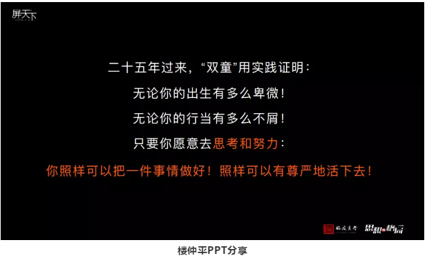 因此,樓仲平引導(dǎo)企業(yè)主們:如果你的企業(yè)還很小、很卑微,一定不要對(duì)自己失去信心,要理解商業(yè)的積累。無(wú)論你的行業(yè)有多小,只要你意愿思考和努力,努力代表認(rèn)真,但前提在于思考。從各個(gè)角度去思考,認(rèn)真的去履行,是可以改變命運(yùn)的,改變?nèi)魏嗡^“不好”的產(chǎn)業(yè),所謂的“不好”并不存在。“做什么”并不重要,重要的是“怎么做”!