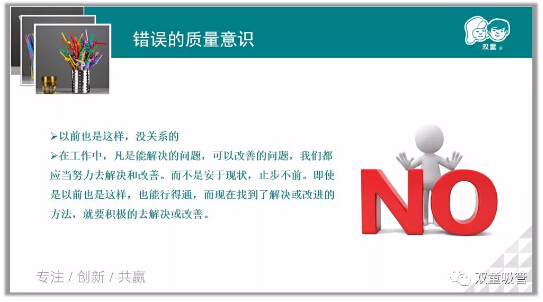 最重要的,就是樹(shù)立正確的質(zhì)量意識(shí)。在工作中,凡是能解決的問(wèn)題,可以改善的問(wèn)題,我們都應(yīng)當(dāng)努力去解決和改善,而不是安于現(xiàn)狀,止步不前。即使是以前也這樣能行得通,但現(xiàn)在找到了解決或改進(jìn)的方法,就要積極的去解決或改善。