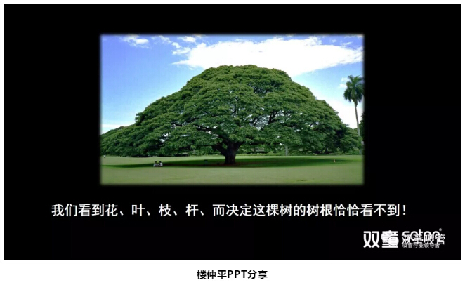 緊接著,樓仲平通過一棵樹的圖片,再次引導(dǎo)大家思考:我們通過圖片能看到樹的樹干、樹枝、樹葉等,但是真正決定這棵樹的樹根,卻并不能直接看到。