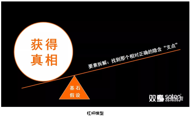 它背后的邏輯其實很簡單,即通過不斷地要素拆解,找到相對正確的“基石假設(shè)”,把它作為一個支點,從而撬動了思維。