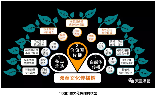 “雙童”的傳播工作主要通過亮點營造、自媒體傳播、價值觀傳播三大模塊來實現(xiàn)。下圖就是“雙童”的文化傳播樹模型。