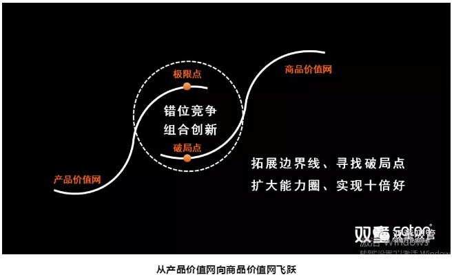 由此,“雙童”通過錯位競爭和組合創(chuàng)新的方式,從產(chǎn)品價值網(wǎng)跳躍到商品價值網(wǎng),實現(xiàn)十倍好!