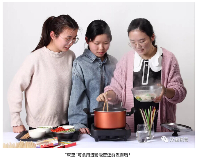 除此之外,“雙童”歷經(jīng)三年潛心研發(fā),新推出了可食用淀粉吸管,是完全采用小麥、大米、玉米、木薯、土豆等天然農(nóng)作物淀粉,經(jīng)高溫、高壓、熟化、擠出、烘干精制而成!