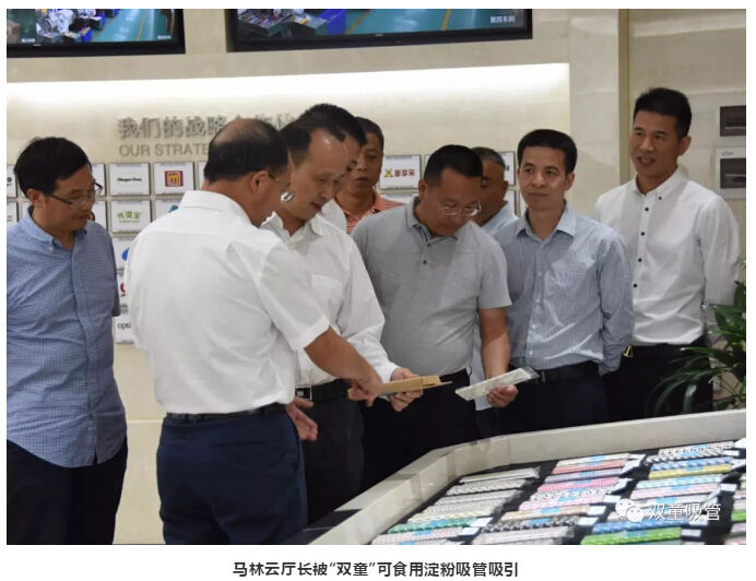 在參觀過程中,馬林云廳長被“雙童”可食用淀粉吸管所吸引?!半p童”可食用淀粉吸管完全采用小麥、大米等天然農(nóng)作物淀粉制作而成,它不僅可以煮成面條,而且可以喂養(yǎng)牲畜。在使用丟棄后,短時間內(nèi)也能在任何生態(tài)環(huán)境下完全自然化解,非常環(huán)保!