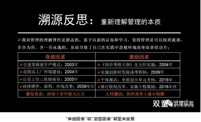 “雙童”樓仲平也曾在學(xué)習(xí)會(huì)上談到,員工與組織的關(guān)系就是一種彼此交換、彼此協(xié)作、彼此默契、彼此期望的雇傭關(guān)系,所以本質(zhì)上就無法像對(duì)待“家人”一樣對(duì)待員工,否則就會(huì)出現(xiàn)雙方彼此期待的背離,從而給雙方帶來傷害。