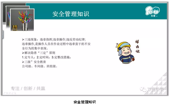 每到安全月,我們都會(huì)舉辦安全主題的學(xué)習(xí)會(huì)。今年的6月同樣也不例外。近日,“雙童”全體員工圍繞著“安全”這件大事開(kāi)展了專題學(xué)習(xí)會(huì)!接下來(lái),吸管妞就帶大家一起來(lái)學(xué)習(xí)安全知識(shí)吧!