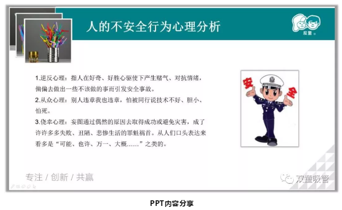 緊接著,李講師也分析了人的不安全行為心理,違章的人一般都有著逆反心理、從眾心理、僥幸心理、冒險(xiǎn)心理…… 他們?cè)趯?shí)際操作中始終抱著僥幸心理,錯(cuò)誤地認(rèn)為“違章不一定出事,出事不一定傷人,傷人不一定傷己,傷己不一定死人”,從而導(dǎo)致各類安全事故的發(fā)生!李講師也警醒同學(xué)們:在工作和生活當(dāng)中千萬(wàn)不要抱有這幾種心態(tài),避免安全隱患的發(fā)生!