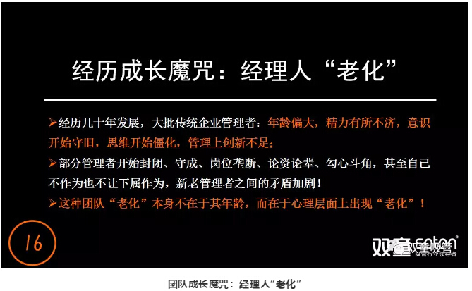 以“雙童”為例:在公司創(chuàng)辦初期聘用的一批管理層,在2010年前后,大部分管理人員逐漸出現(xiàn):依托于慣性思維,憑經(jīng)驗用老方法解決新問題,不愿意學習等問題,團隊的成長也因此遇到了瓶頸。