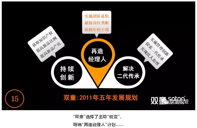 基于上述瓶頸,公司在2011年發(fā)布了第三個《企業(yè)五年發(fā)展規(guī)劃》,明確“再造經(jīng)理人”計劃,明確領(lǐng)導層更替:選拔培養(yǎng)年輕領(lǐng)導層、重要崗位領(lǐng)導年輕化、明確實施股份制改革,慢慢解決管理層老化問題!