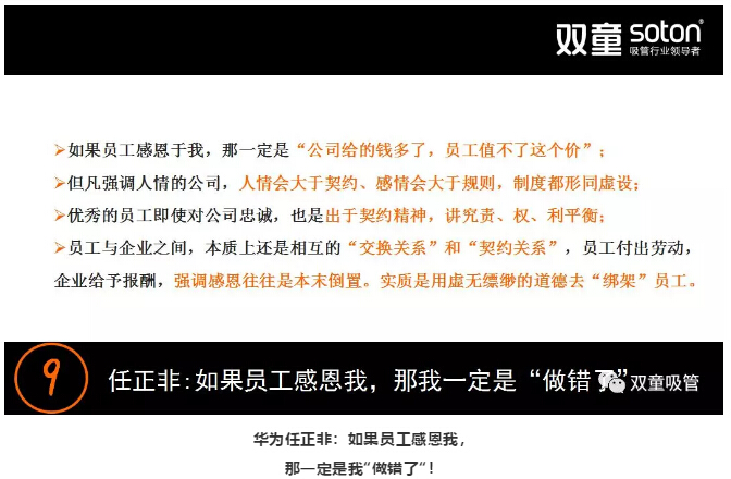 “雙童”樓仲平在課程分享時曾說道:“許多人無法理解華為,但企業(yè)是以產(chǎn)出效益為追求使命的,如果你一天到晚講人情,講情懷,講感恩......把這些放到企業(yè)當中,一定會出問題的?!?/span>