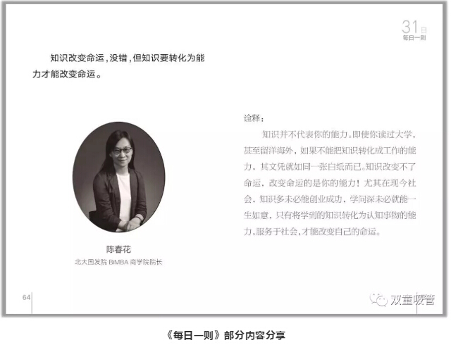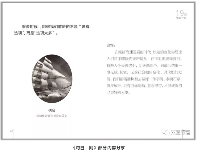 這本《每日一則》里,共收錄了31句名人經(jīng)典語(yǔ)錄,以月度為單位讓員工進(jìn)行重復(fù)誦讀,內(nèi)容包含了專注、創(chuàng)新、共贏、正氣等主題。這可是員工們從幾千條好句里挑出來,并且自己解析的呢!