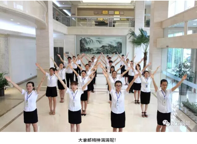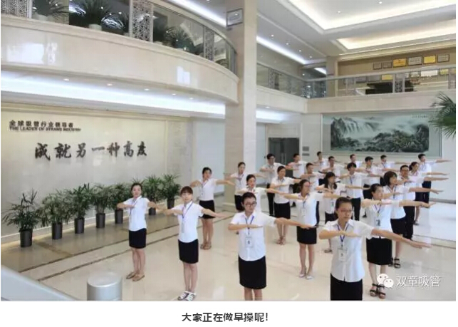 除了精神上要得到提升之外,我們的身體素質(zhì)也非常重要!每天,在晨讀環(huán)節(jié)結(jié)束之后,我們都會(huì)進(jìn)行早操活動(dòng)。俗話說,“一年之際在于春,一天之際在于晨”。在“雙童”行政大廳,員工們列隊(duì)整齊,精神飽滿,氣宇軒昂,伴著豪邁的音樂,用整齊劃一的動(dòng)作做起早操,形成了一道靚麗的風(fēng)景線。