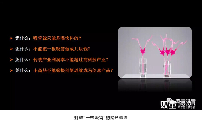 答:在生活中,許多人都容易陷入自身的“隱含假設(shè)”中,認(rèn)為吸管這類產(chǎn)品就是“低、小、散、弱”,但“雙童”卻在2005年提出:吸管不僅僅是用來喝飲料的,這一個認(rèn)知就打破了“吸管只是用來喝飲料”這個“隱含假設(shè)”。
