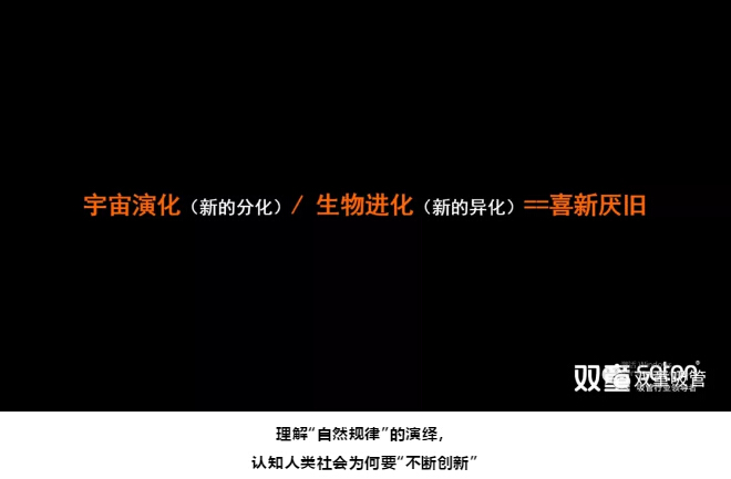 樓仲平繼續(xù)分享道:要真正認(rèn)知“創(chuàng)新”,首先要多去學(xué)習(xí)那些看似“無用”的知識,運(yùn)用天文學(xué)、生物學(xué)、物理學(xué)的宏觀角度,理解在“自然規(guī)律”的演繹和進(jìn)化,再通過逐級推理的方式去認(rèn)知人類社會為什么要“不斷創(chuàng)新”。