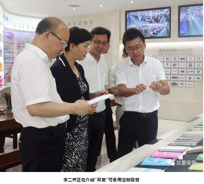 王文序副省長聽完介紹后,對這款綠色環(huán)保的可食用淀粉吸管稱贊連連。