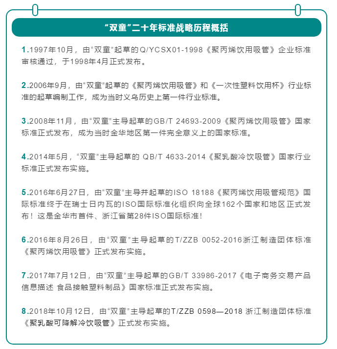 在許多人的印象中,像吸管這樣的小商品很難做品牌,更沒有生產(chǎn)標(biāo)準(zhǔn)可言。所以當(dāng)大家來到吸管產(chǎn)業(yè)發(fā)展資料展示區(qū),看到“雙童”先后主導(dǎo)起草了如此多個標(biāo)準(zhǔn)時,大家紛紛表示顛覆了他們對“小商品”的認(rèn)知!