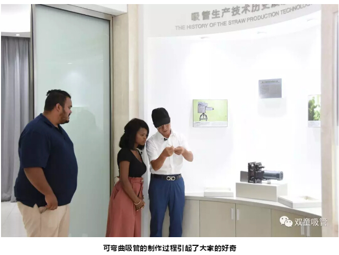 在參觀過(guò)程中,樓仲平也向南非友人介紹了早期可彎吸管的制作過(guò)程:吸管通過(guò)成型機(jī)器壓出折彎波紋后,工人們?cè)儆靡桓曜訉⑽軘D壓出彎節(jié),形成可彎吸管。南非友人在看完演示后恍然大悟,表示他們從沒(méi)想過(guò)原來(lái)早期吸管是這樣巧妙地做成的!