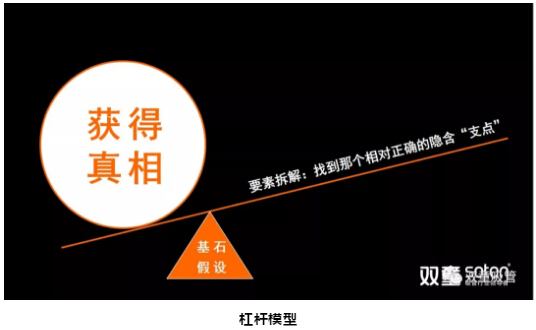 它背后的邏輯其實(shí)很簡單,即通過不斷地要素拆解,讓我們看到內(nèi)在的“隱含假設(shè)”,從而進(jìn)行下移來獲得更加正確的“基石假設(shè)”,從而撬動(dòng)了思維,獲得真相!