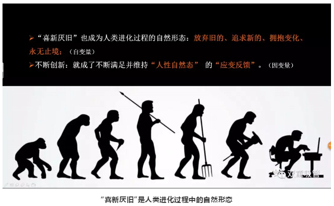 人類作為生物進(jìn)化的物種,其屬性遵循自然規(guī)律,本性就是“喜新厭舊”的。因此,不斷創(chuàng)新就成了不斷滿足并維持“人性自然態(tài)” 的“應(yīng)變反饋”。