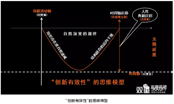 在“創(chuàng)新思維模型”中:組織作為萬物當(dāng)中的組成部分,在自然演變的過程當(dāng)中組織存在“自然遞減”。為了保證組織持續(xù)存在,就需要不斷地調(diào)整和干預(yù),從而延緩組織自然墮變,保持組織活力!