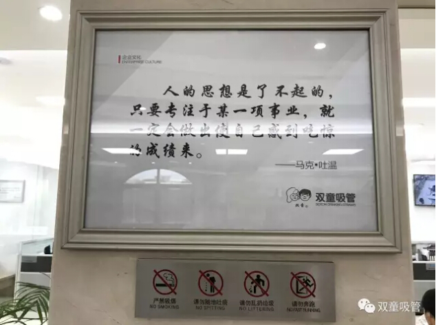 這些文化標(biāo)語,可不是隨便找來掛一掛的哦!它們都是從幾千句名人名言、經(jīng)典好書中擇取篩選出來,并經(jīng)過我們的詳細(xì)注釋,成為“雙童”企業(yè)文化的一部分!