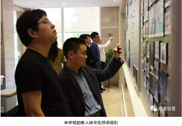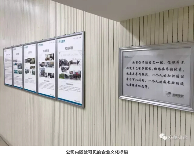原來,在“雙童”行政樓的墻上,到處都掛著一幅幅精致的鏡框,而鏡框里的內(nèi)容,就是能夠體現(xiàn)“雙童”核心文化價(jià)值觀的文化標(biāo)語!