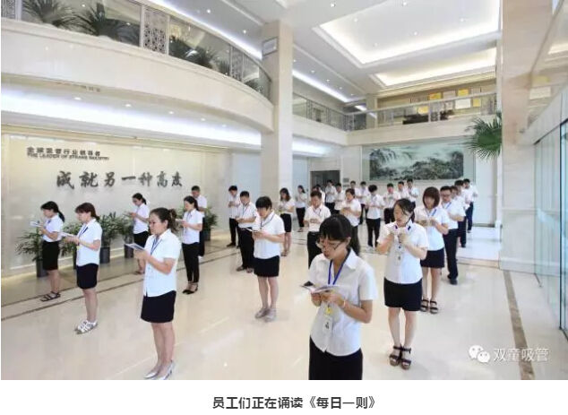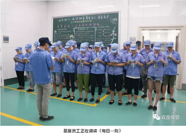 當(dāng)然,“雙童”的這些文化標(biāo)語除了在墻面展示之外,也被收錄到“雙童”企業(yè)文化叢書《每日一則》當(dāng)中,每天誦讀一篇《每日一則》成為“雙童”員工們的必修課,哪怕是在車間里工作的基層員工也是每天雷打不動(dòng)地要誦讀哦!